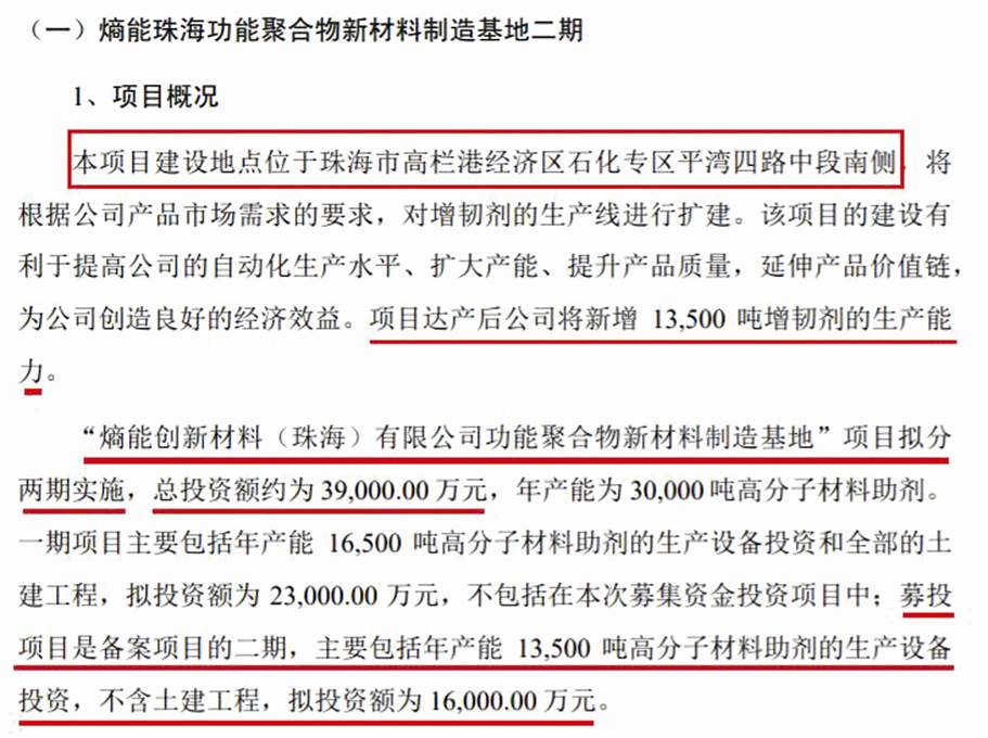 查阅最新招股书可见,公司此次核心募投项目,即熵能珠海基地二期的建设地点位于珠海市高栏港经济区石化专区平湾四路中段南侧,将根据公司产品市场需求,对增韧剂的生产线进行扩建,项目达产后公司将新增13500吨增韧剂的生产能力。具体来看,建设投资1.30亿元,预备费及铺底流动资金3000万元,项目建设期为12个月。