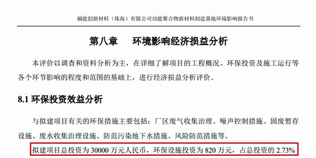 然而值得注意的是,《大众证券报》明镜财经工作室记者调查发现,公司招股书披露的包含核心募投项目的熵能珠海基地项目投资总额3.90亿元,明显高于该项目环评报告书显示的投资金额;同时,核心募投项目的环保投资更是超过整个熵能珠海基地项目环评报告显示的环保投资金额。