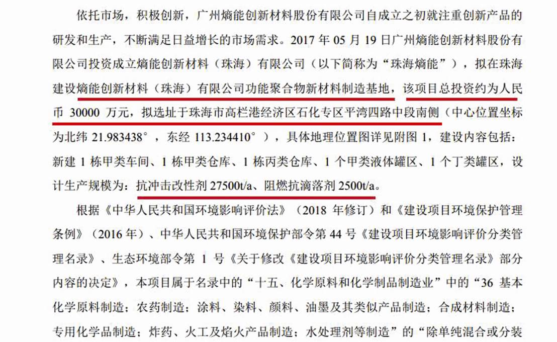 查阅珠海生态环境局的环评批复公示发现,2020年4月16日受理、当年6月5日批复同意的熵能珠海基地项目,设计年产功能聚合物新材料30000吨,其中抗冲击改性剂27500吨/年(增韧剂属于此类),阻燃抗滴落剂2500吨/年。
