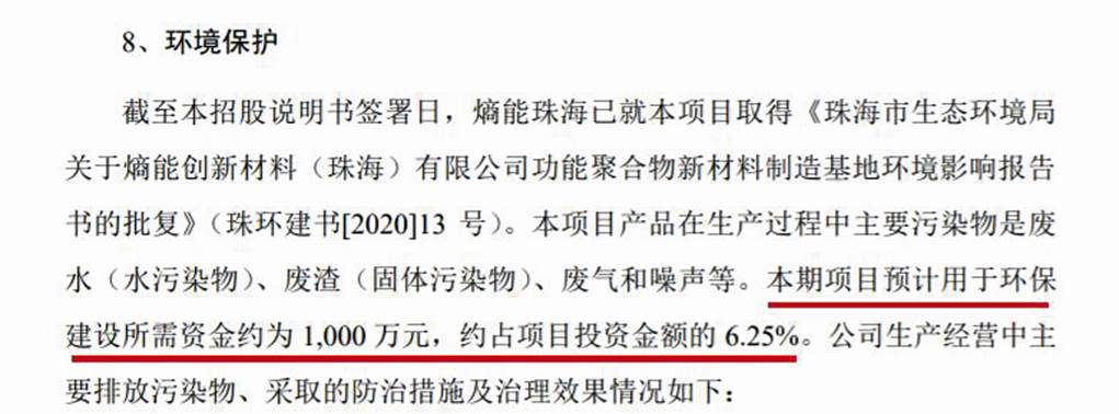 公司招股书中则称,“截至本招股说明书签署日,熵能珠海已就本项目取得《珠海市生态环境局关于熵能创新材料(珠海)有限公司功能聚合物新材料制造基地环境影响报告书的批复》(珠环建书[2020]13 号)。本项目产品在生产过程中主要污染物是废水(水污染物)、废渣(固体污染物)、废气和噪声等。本期项目预计用于环保建设所需资金约为1000万元,约占项目投资金额的6.25%。”(见图五)