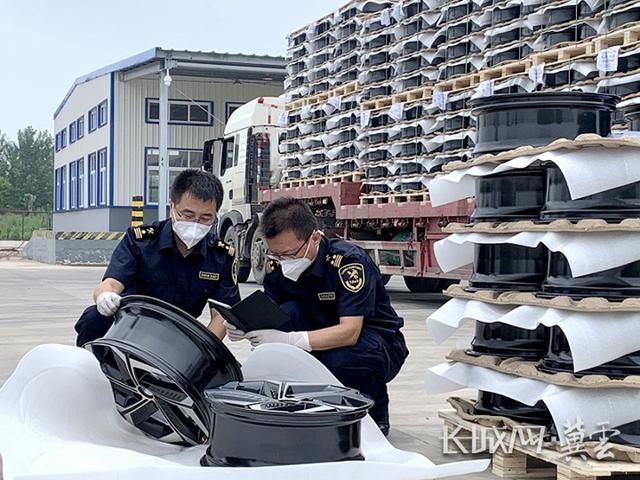 海关关员在秦皇岛综保区查验即将出口的铝合金汽车轮毂 王刚 摄