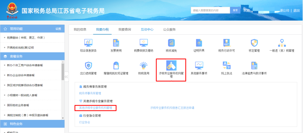 登录江苏省电子税务局,点击“我要办税”—“涉税专业服务机构管理”—“其他涉税专业服务机构管理”。