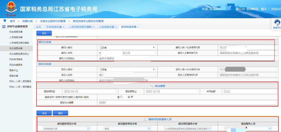 点击“协议信息采集”,填写委托方信息、协议摘要、服务项目及服务人员等信息。