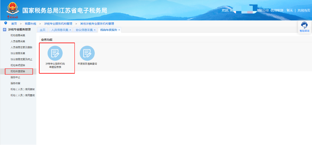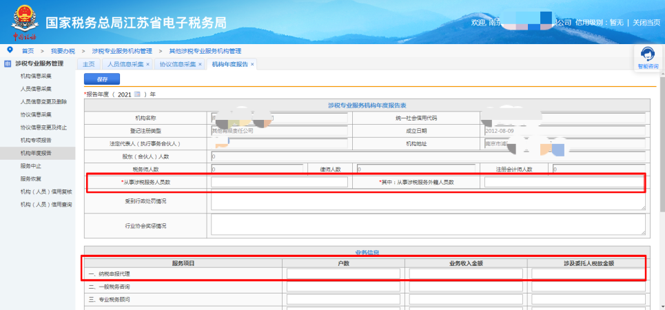 点击“机构年度报告”—“涉税专业服务机构年度报告表”,填写从事涉税服务人员数和业务信息等项目。