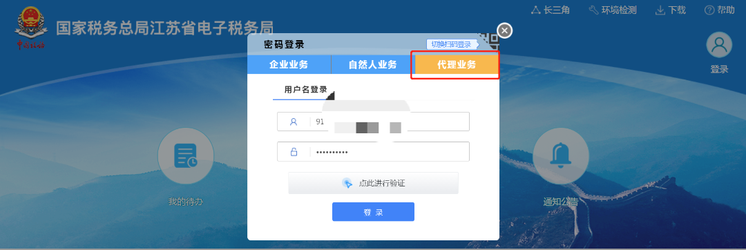 点击“代理业务”,输入单位的税号和密码,点击“登录”按钮。