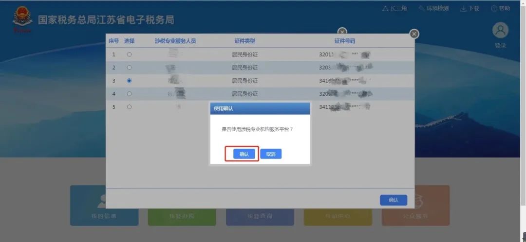 跳出对话框“是否使用涉税专业机构服务平台”,点击确认。