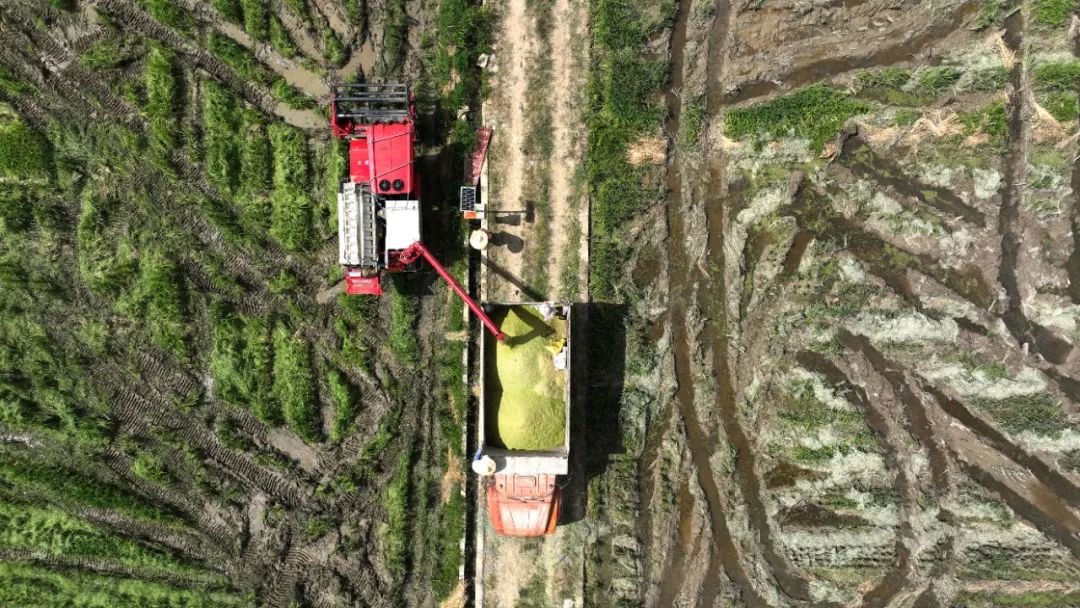 “开镰咯!”随着农机手一声轻快地呐喊,四台收割机“轰隆轰隆”地驶向稻田,割稻、脱粒、装运......田野上奏响的杂交种稻“丰收曲”格外动听。