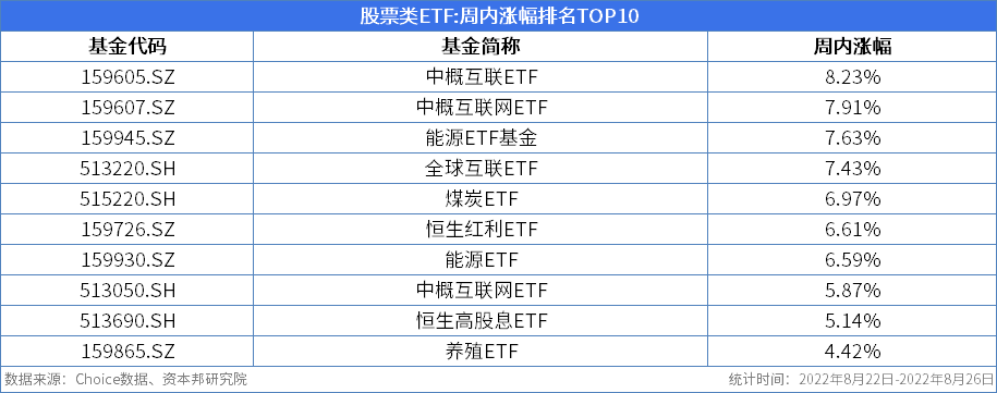 具体来看,周内涨幅榜TOP10中的股票类场内ETF,1只上涨幅度超8%,为广发基金旗下的中概互联ETF(159605),周内上涨8.23%。紧随其后的是,嘉实基金中概互联网ETF(159607)、广发基金能源ETF基金(159945)、招商基金全球互联ETF(513220),周内分别上涨7.91%、7.63%、7.43%。