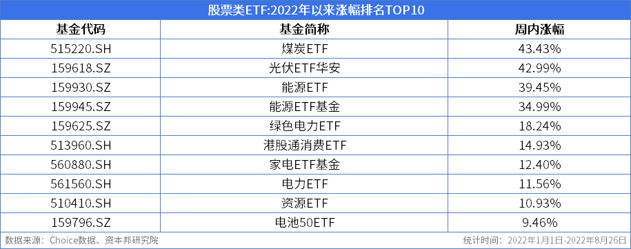 2022年初以来涨幅排名TOP10中还有嘉实基金绿色电力ETF(159625)、博时基金港股通消费ETF(513960)、广发基金家电ETF基金(560880)、华泰柏瑞基金电力ETF(561560)、博时基金资源ETF(510410)、汇添富基金电池50ETF(159796),分别上涨18.24%、14.93%、12.40%、11.56%、10.93%、9.46%。