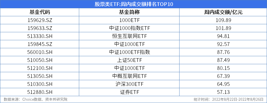 成交额榜单前十的ETF中还有广发基金中证1000ETF指数(560010)、华夏基金上证50ETF(510050)、南方基金中证1000ETF(512100)、易方达基金中概互联网ETF(513050)、华泰柏瑞基金沪深300ETF(510300)、国泰基金证券ETF(512880),周内分别累计成交87.76亿元、87.49亿元、80.15亿元、67.39亿元、64.95亿元、57.13亿元,位居第五至第十位。