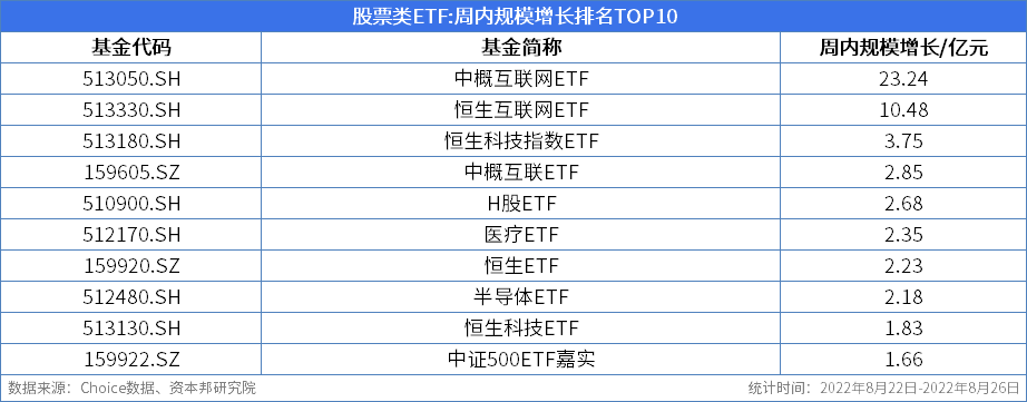 此外,华夏基金恒生科技指数ETF(513180)、广发基金中概互联ETF(159605)、易方达基金H股ETF(510900)、华宝基金医疗ETF(512170)、华夏基金恒生ETF(159920)、国联安基金半导体ETF(512480)、华泰柏瑞基金恒生科技ETF(513130)、嘉实基金中证500ETF嘉实(159922),周内规模分别新增为3.75亿元、2.85亿元、2.68亿元、2.35亿元、2.23亿元、2.18亿元、1.83亿元、1.66亿元,同样位居周内新增规模排名前十名单。