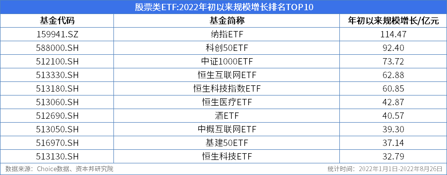 2022年初以来,合计181只股票类ETF规模实现增长。其中,13只规模增长超30亿元,广发基金、华夏基金、南方基金旗下:纳指ETF(159941)、科创50ETF(588000)、中证1000ETF(512100),年初以来规模分别增长114.47亿元、92.4亿元、73.72亿元,位居新增规模第一、二、三名。