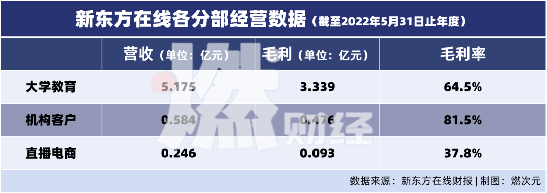 就毛利及毛利率来说,直播电商的表现也不算优异。同据新东方在线2022财年业绩数据,大学教育业务毛利为3.34亿元,毛利率高达64.5%;机构客户业务毛利0.58亿元,毛利率81.5%;而直播电商业务毛利仅0.09亿元,毛利率为37.8%。