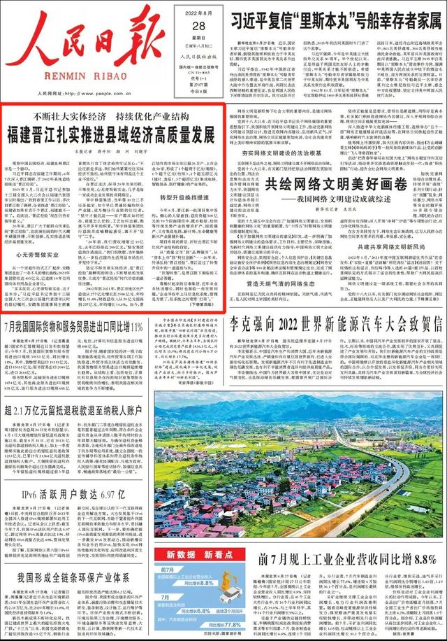 泉州晚报社·泉州通客户端8月29日讯(泉州晚报记者 郭雅莹)8月28日,《人民日报》头版头条刊发通讯——《福建晋江扎实推进县域经济高质量发展》,点赞晋江广大干部群众传承弘扬“晋江经验”,心无旁骛做实业,坚定不移发展实体经济,不断优化产业结构,坚持工业化、城市化“双轮驱动”,扎实推进县域经济高质量发展。