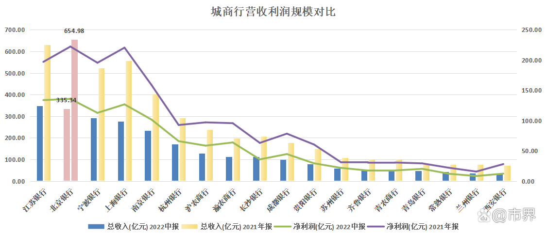 将北京银行的营收净利规模与其它上市城商行进行对比,发现该行处于领先地位。2022年上半年,北京银行实现净利润135.74亿,在城商行中位居榜首;收入水平在城商行中位列第二,仅次于江苏银行的347.32亿元,除此之外,北京银行还是唯一一家资产规模超3万亿的城商行。