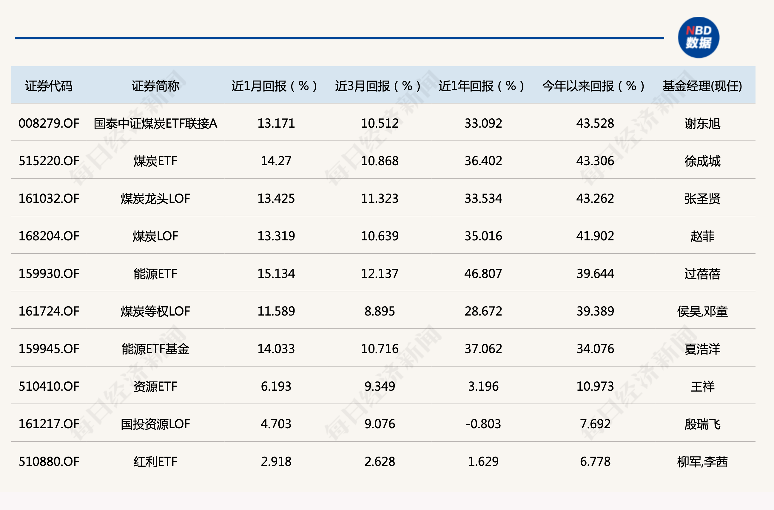 再看一下被动指数型基金的“牛基”TOP10榜,登上此榜单的产品,依然以煤炭、石油等资源类等产品为主,且收益率比上个月末进一步提升了超过10个百分点。