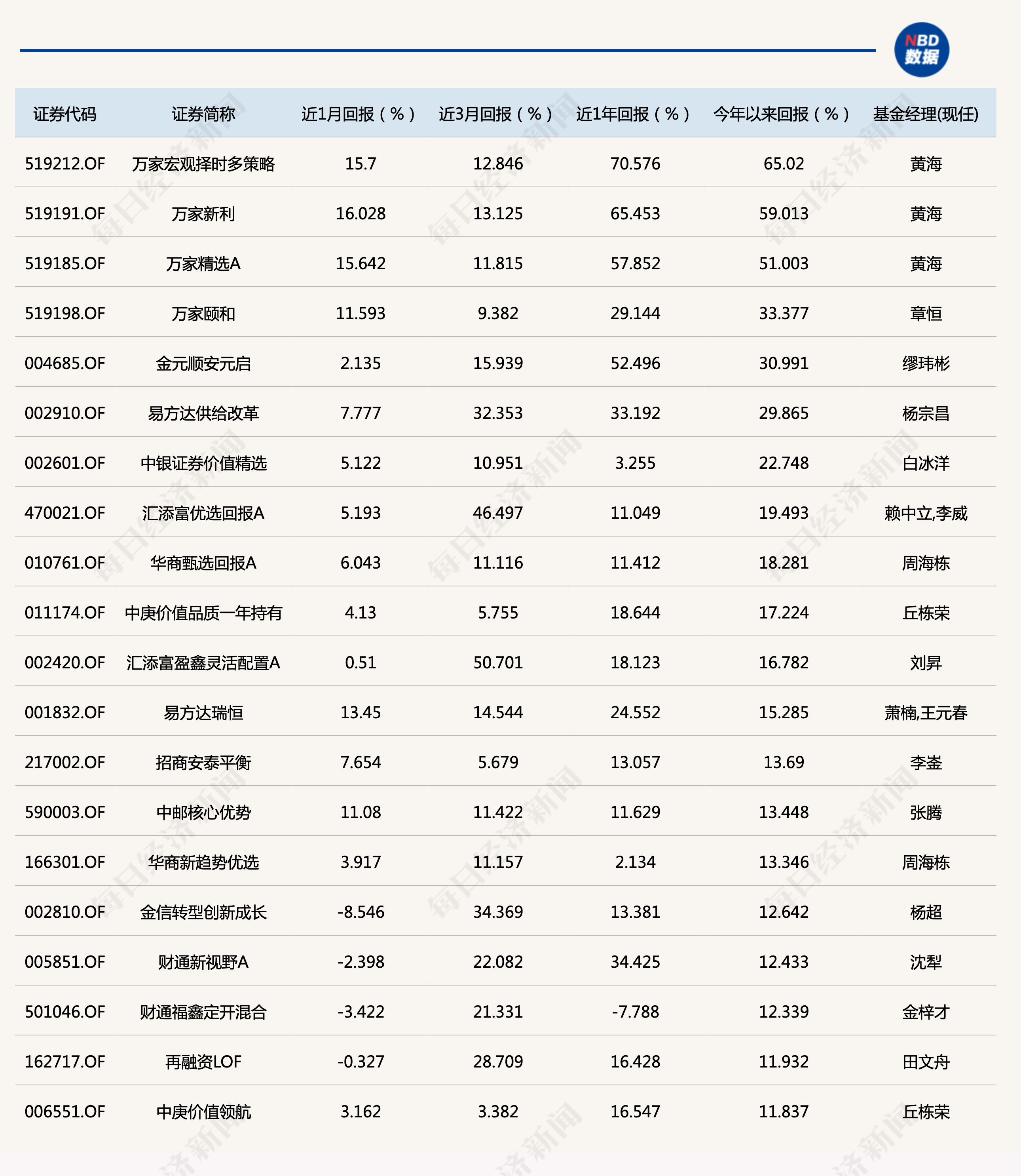 接下来,看市场关注度最高的混合型基金的业绩排名。截至8月29日,万家基金黄海管理的三只产品继续包揽了混基的前三名。尽管7月份,黄海管理的产品业绩略有回落,但8月市场调整的同时,他的业绩不但没有下跌,反而进一步扩大领先优势,和后面的产品拉开了差距。