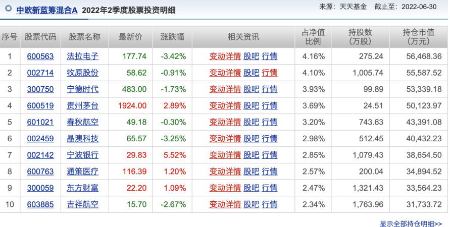 最后,看一下周蔚文管理的中欧新蓝筹的情况。中欧新蓝筹混合目前规模123.37亿元,截至二季度末的股票仓位只有78%,这和其他很多主动型产品超过90%的仓位有很大区别。这或许也是这位双十基金经理在弱势市道中主动防御的策略。