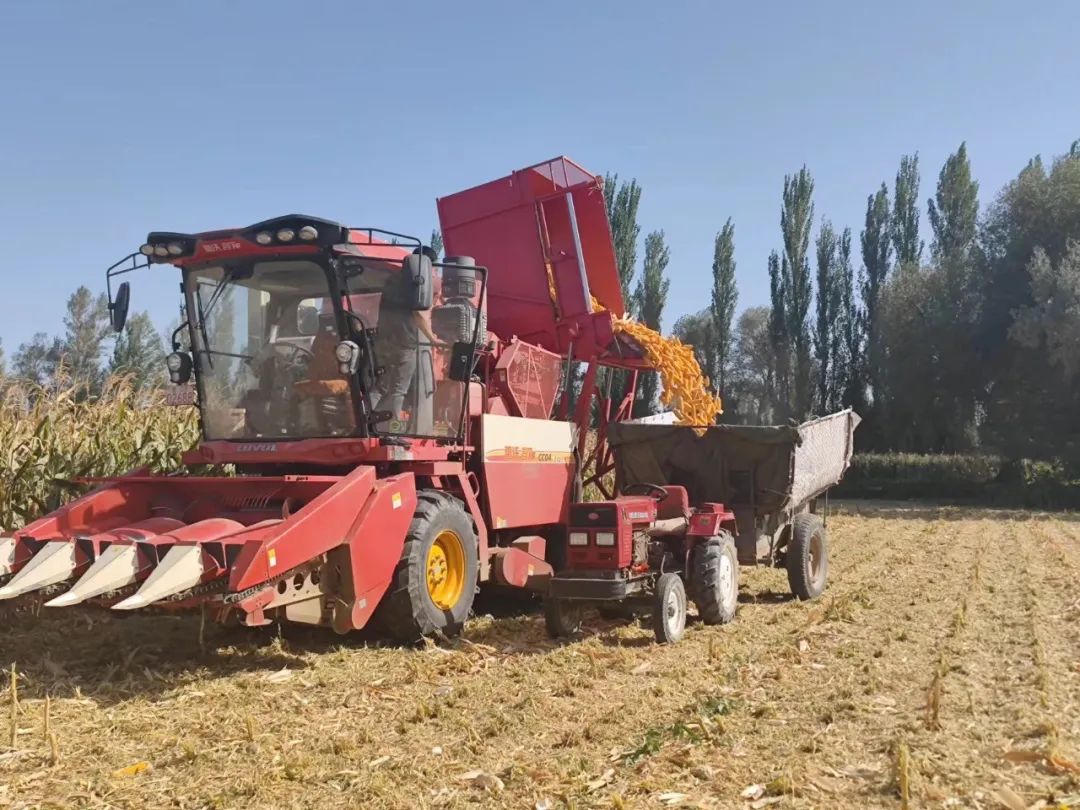 敦煌市黄渠镇托管玉米收割现场。郭娜摄