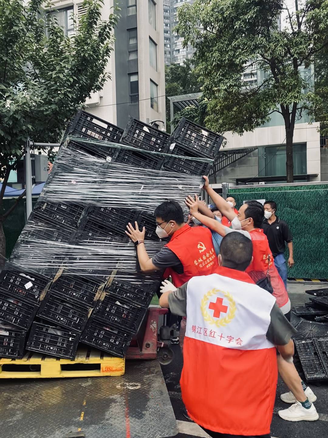 驻点支援队伍按街道统一调度安排,严格做好自身防护,不畏艰险、迎难而上,为社区居民建好防疫防护墙。第一组和第六组队员组成小区人员排查队伍,前往香樟社区荟菁阁、绿地云玺468、绿地468等小区开展排查工作,共排查6099户、12199人,排查出未登记人员5人。第一、四、五三个物资转运小组当日共卸载转运物资15吨、分发4500余件。第四小组于16时接到社区紧急任务,前往高风险区华韵天府小区开展生活物资卸载转运工作。为保障社区居民晚饭有菜吃、锅中有米下,第四小组8名队员和社区工作人员一道,仅用2个小时即卸载转运米面油菜和日用品等生活物资2000件,重量超过5吨。其中蔬菜框单个重量在30kg以上,志愿者连续卸载近百框,转运分发1000余件。有物资转运组志愿者膝盖韧带撕裂,推迟入院时间,坚持参加志愿服务,仍然冲锋在前,勇为人先。第三组志愿者分散在多个交通卡口,对出入车辆人员进行登记检查,最晚在卡口坚守到23点,共检查出入片区人员近4000人次,车辆150余辆,大大减轻了卡口工作压力。支援队伍还按街道要求,留出机动人员通宵值守,在有需要的情况下,承担陪同护送社区老年人、重症病人就医等任务。