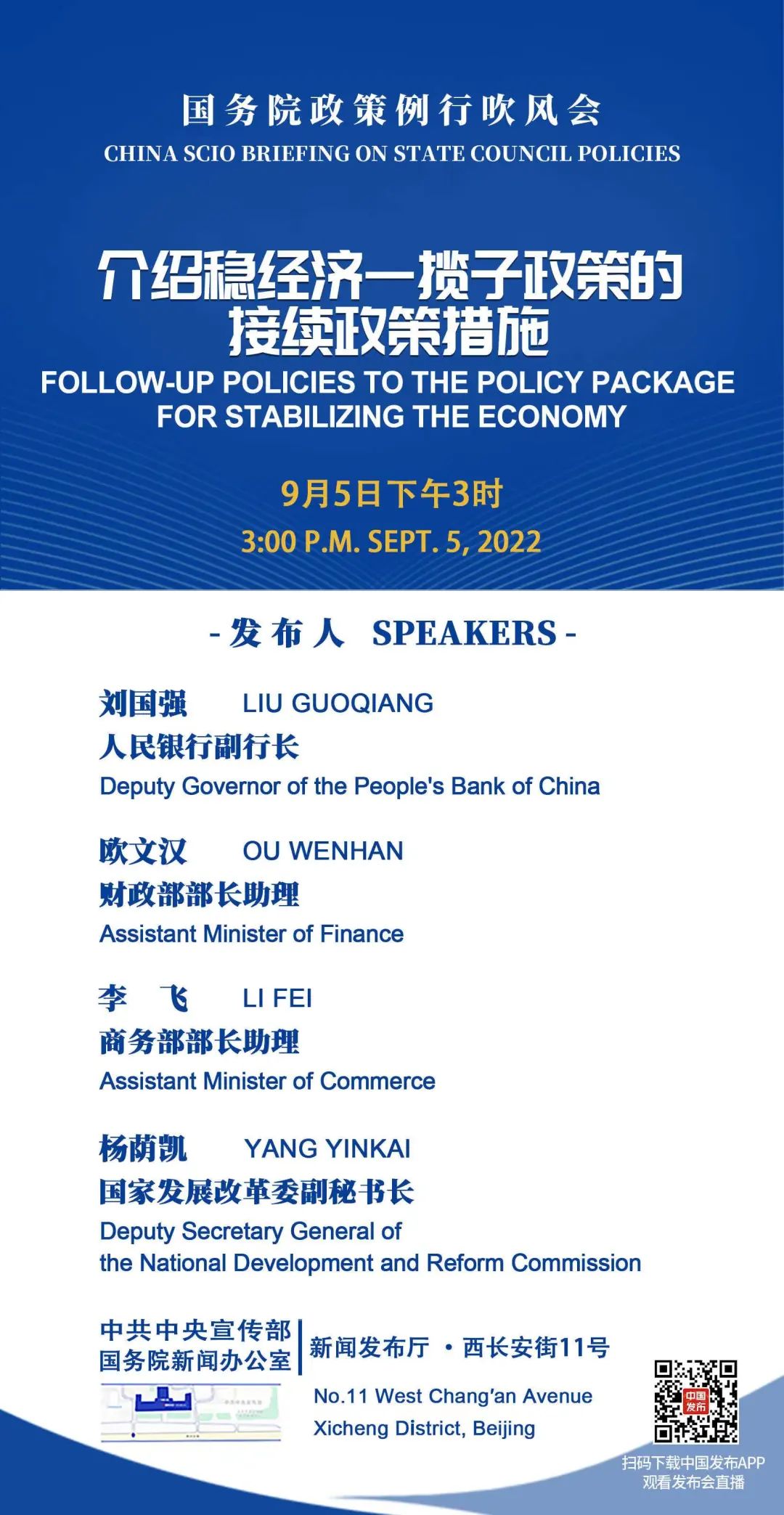 国务院新闻办公室将于2022年9月5日(星期一)下午3时举行国务院政策例行吹风会,介绍稳经济一揽子政策的接续政策措施,并答记者问。