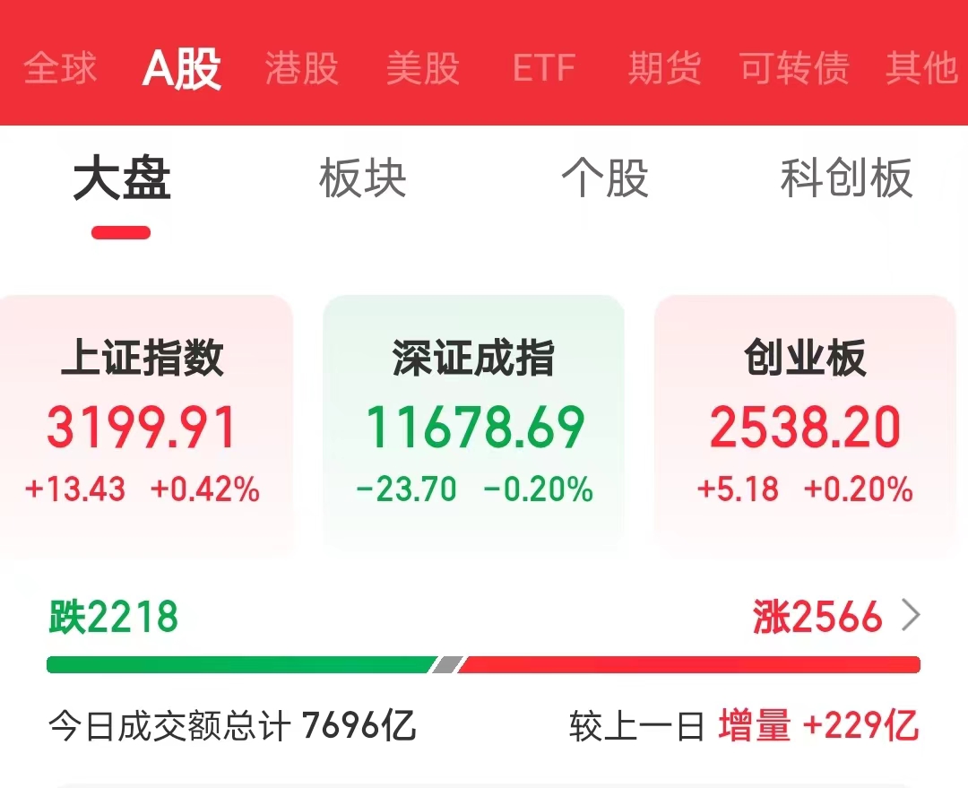 中新经纬9月5日电 5日,沪指午后震荡反弹,创业板指尾盘拉升翻红。上证指数收涨0.42%,报3199.91点。深证成指跌0.20%,报11678.69点。创业板指涨0.20%,报2538.20点。