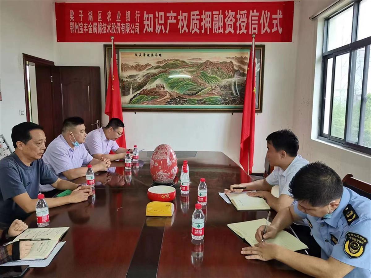 “没想到,前天申报的知识产权质押货款100万元,今天农行梁子湖支行今天就批下来了,真是雪中送炭。”在知识产权质押融资授信仪式上,鄂州宝丰金属棉技术股份有限公司公司董事长刘国楷开心地说。