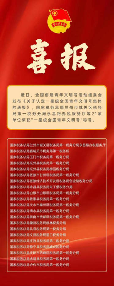 近日,全国创建青年文明号组委会发布《关于认定一星级全国青年文明号集体的通报》,国家税务总局兰州市城关区税务局第一税务分局永昌路办税服务厅等21家单位荣获“一星级全国青年文明号”称号。