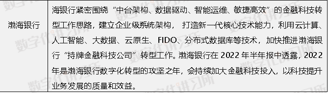渤海银行在2021年年报中透露,渤海银行紧密围绕“中台架构、数据驱动、智能运维、敏捷高效”的金融科技转型工作思路,建立企业级系统架构, 打造新一代核心技术能力,利用云计算、人工智能、大数据、云原生、FIDO、分布式数据库等技术,加快推进渤海银行“持牌金融科技公司”转型工作。渤海银行在2022年半年报中透露,2022年是渤海银行数字化转型的攻坚之年,会持续加大金融科技投入,以科技提升业务发展的质量和效益。