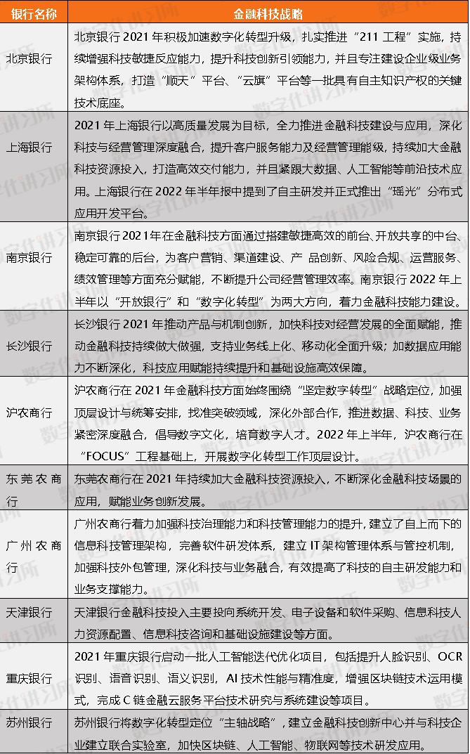 中小银行金融科技战略相比于国有大行和股份制银行来说,多集中于某一方面,例如北京银行2021年并且专注建设企业级业务架构体系,打造“顺天”平台、“云旗”平台等一批具有自主知识产权的关键技术底座;上海银行主要发力点在大数据和人工智能方面;南京银行2021年金融科技方面专注搭建敏捷高效的平台等,还有不少中小银行集中于加快数字化进程,例如沪农商行、苏州银行和青岛银行。重庆银行和苏州银行在金融科技方面也引进了例如区块链等高新技术。还有中小银行2021年金融科技主要投入在了银行APP建设和科技场景应用等方面。总体来看,中小银行的金融科技方面还有很大的发展空间。