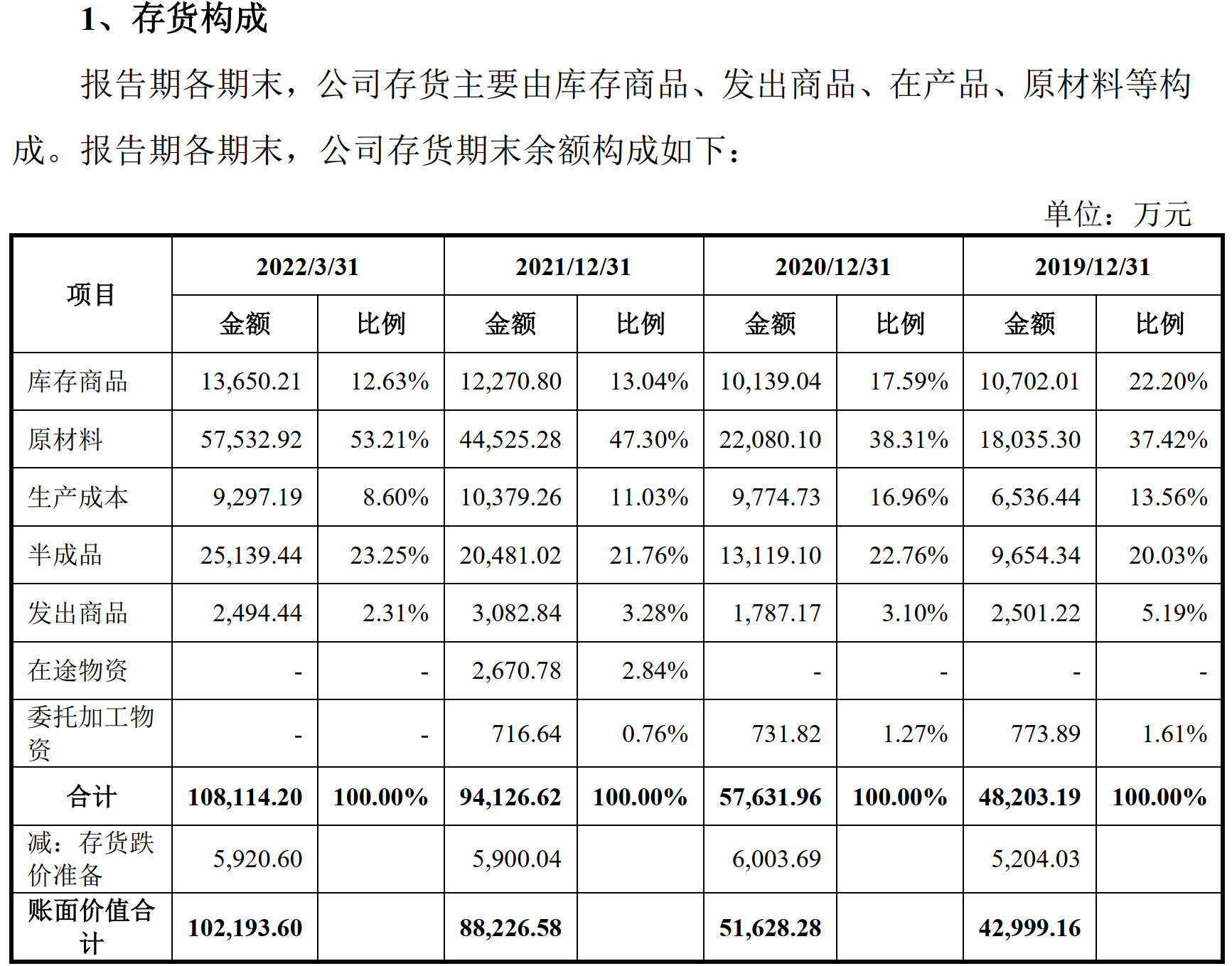 2019年底、2020年底、2021年底和今年一季度末,立昂微存货余额较高,分别约4.8亿元、5.8亿元、9.4亿元和10.8亿元,存货跌价准备占期末存货总额比例分别为10.80%、10.42%、6.27%和5.48%。