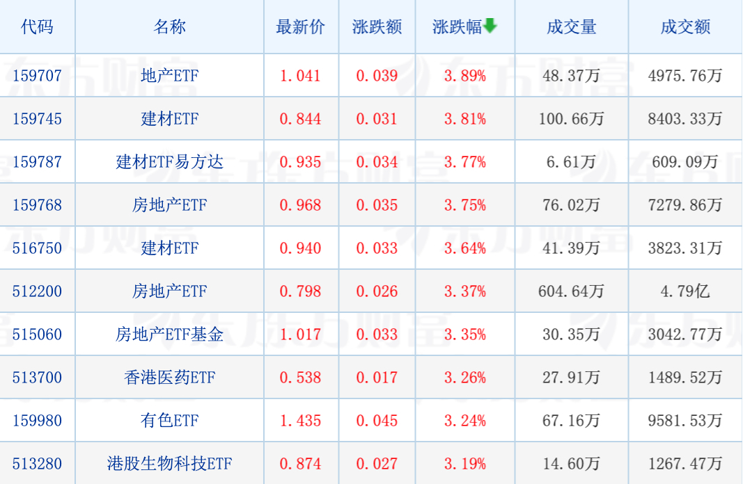 今日,大盘全天震荡走高,三大指数均涨1%左右,地产、金融等权重股表现活跃。值得关注的是,地产产业链个股午后集体走强,坚朗五金、东方雨虹涨停,带动相关ETF大涨,最高上涨3.89%。