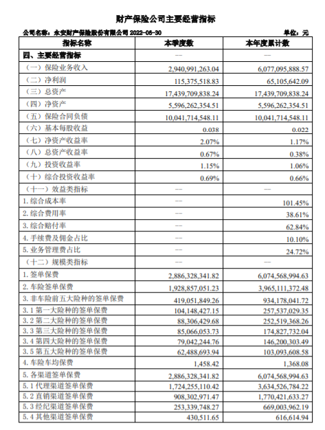 根据永安保险2022年第二季度偿付能力报告显示,公司总资产174.40亿元,净资产55.96亿元,2022年第二季度保险业务收入29.41亿元,实现净利润1.15亿元。
