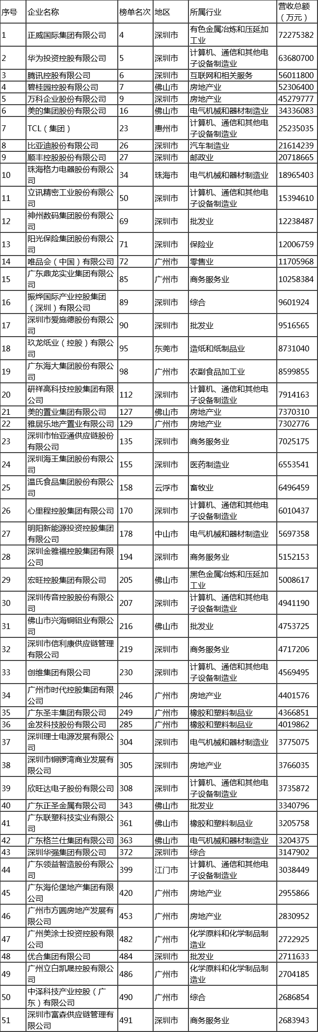 广东共有51家企业入围民营企业500强,主要分布在珠三角地区,其中:深圳25家、广州12家、佛山8家,珠海、东莞、惠州、江门、中山、云浮各1家。