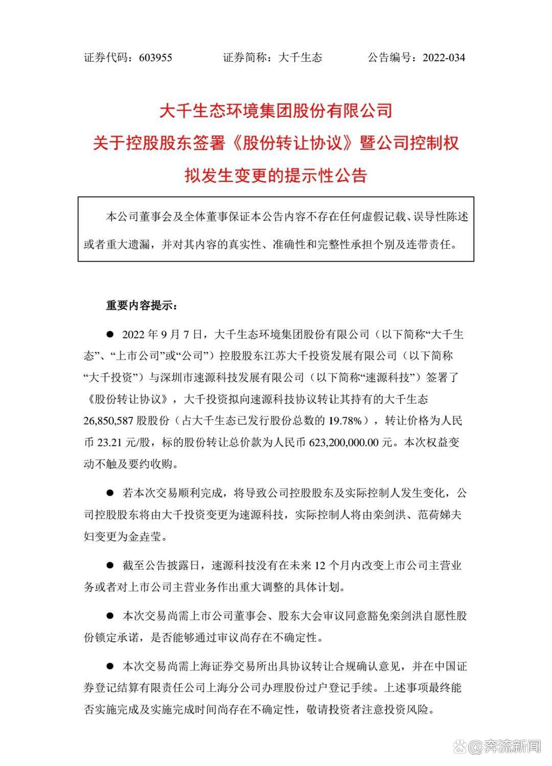 大千生态公告显示,控股股东江苏大千投资与深圳速源科技签署《股份转让协议》,拟协议转让大千生态2685.06万股,占总股份19.78%,转让价23.21元/股,总价6.23亿元。若本次交易顺利完成,公司控股股东及实际控制人发生变化,公司控股股东将由大千投资变更为速源科技,实际控制人将由栾剑洪、范荷娣夫妇变更为金垚莹。