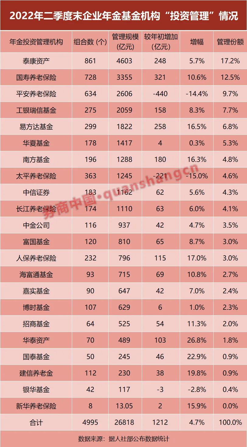 泰康资产、易方达基金的企业年金投资管理规模增加也较多。上半年,泰康资产投管规模增加248亿,增至4603亿,市场排名保持在第一位。易方达基金投管金额增加258亿元,增至1822亿,排名稳定在第五位。