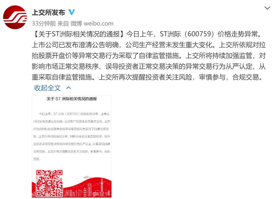 9月13日,@上交所发布 微博发布关于ST洲际相关情况的通报:今日上午,ST洲际(600759)价格走势异常。上市公司已发布澄清公告明确,公司生产经营未发生重大变化。上交所依规对拉抬股票开盘价等异常交易行为采取了自律监管措施。上交所将持续加强监管,对影响市场正常交易秩序、误导投资者正常交易决策的异常交易行为从严认定、从重采取自律监管措施。上交所再次提醒投资者关注风险,审慎参与,合规交易。