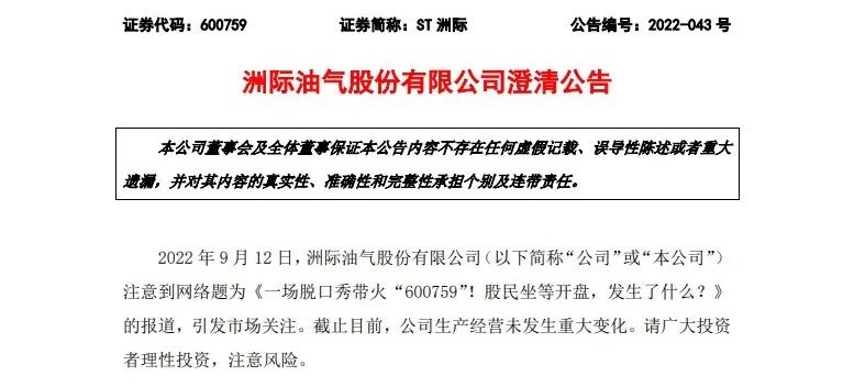 ST洲际发布澄清公告
