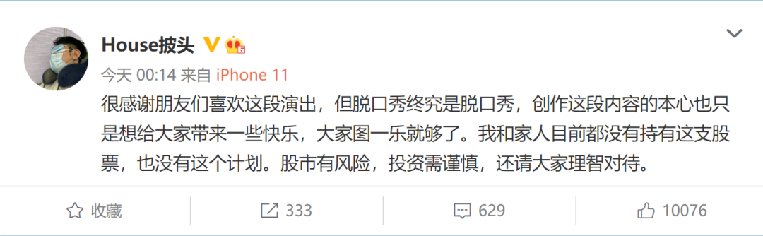 脱口秀演员House回应:没有持有这支股票