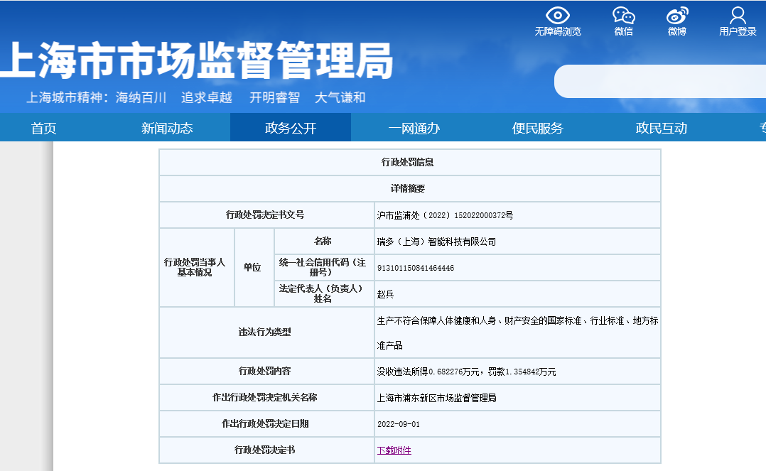 中国网财经9月13日讯 (记者 钟文鑫)据上海市市场监督管理局消息,日前,瑞多(上海)智能科技有限公司因生产、销售不符合国家标准的按摩器具产品被上海市浦东新区市场监督管理局罚款13548.42元,没收违法所得6822.76元。
