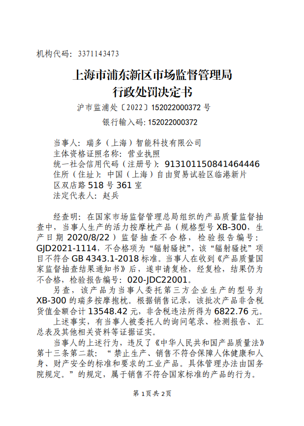 行政处罚决定书显示,在国家市场监督管理总局组织的产品质量监督抽查中,当事人生产的活力按摩枕产品(规格型号 XB-300,生产日期 2020/8/22)监督抽查不合格,检验报告编号:GJD2021-1114,不合格项为“辐射骚扰”,该“辐射骚扰”项目不符合GB 4343.1-2018标准。当事人在收到《产品质量国 家监督抽查结果通知书》后,遂申请复检,经复检,结果仍为不合格,检验报告编号:020-JDC22001。该产品为当事人委托第三方企业生产的型号为XB-300的瑞多按摩抱枕。根据销售记录,该批次产品非含税货值金额合计13548.42元,非含税违法所得为6822.76元。