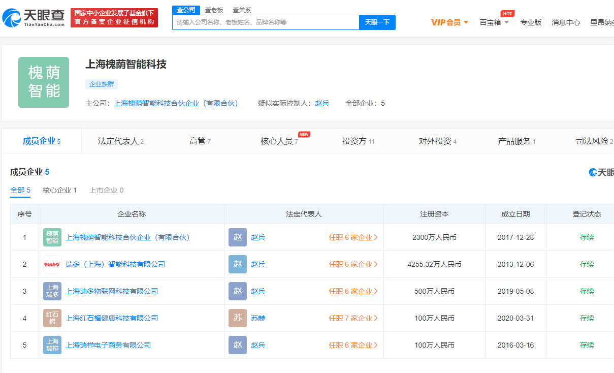 天眼查显示,瑞多(上海)智能科技有限公司成立于2013年12月,注册资本为4255.32万人民币,法定代表人是赵兵。该公司是以上海槐荫智能科技合伙企业(有限合伙)为主公司的企业族群成员之一。