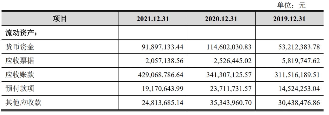 2019年至2021年,公司应收账款分别为3.90亿元、4.71亿元和5.75亿元,占营收的比重分别高达85.23%、83.68%和84.34%,对应的坏账准备金额分别为7828.54万元、8108.84万元和9317.53万元。