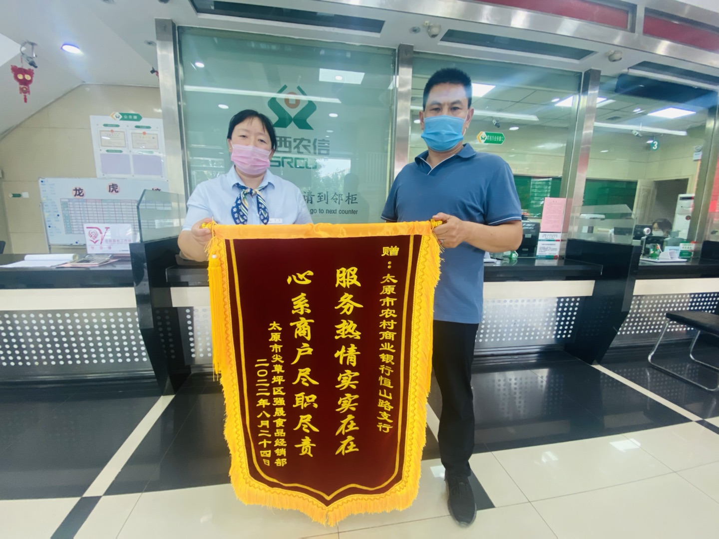 “太感谢咱们银行了,你们辛苦了!”近日,客户刘师傅将一面印有“服务热情实实在在,心系商户尽职尽责”的锦旗送到了山西太原农商银行恒山路支行的营业大厅,将锦旗亲手交给”零币专柜”的柜员梁蓉,并对该支行贴心的服务表示衷心感谢。