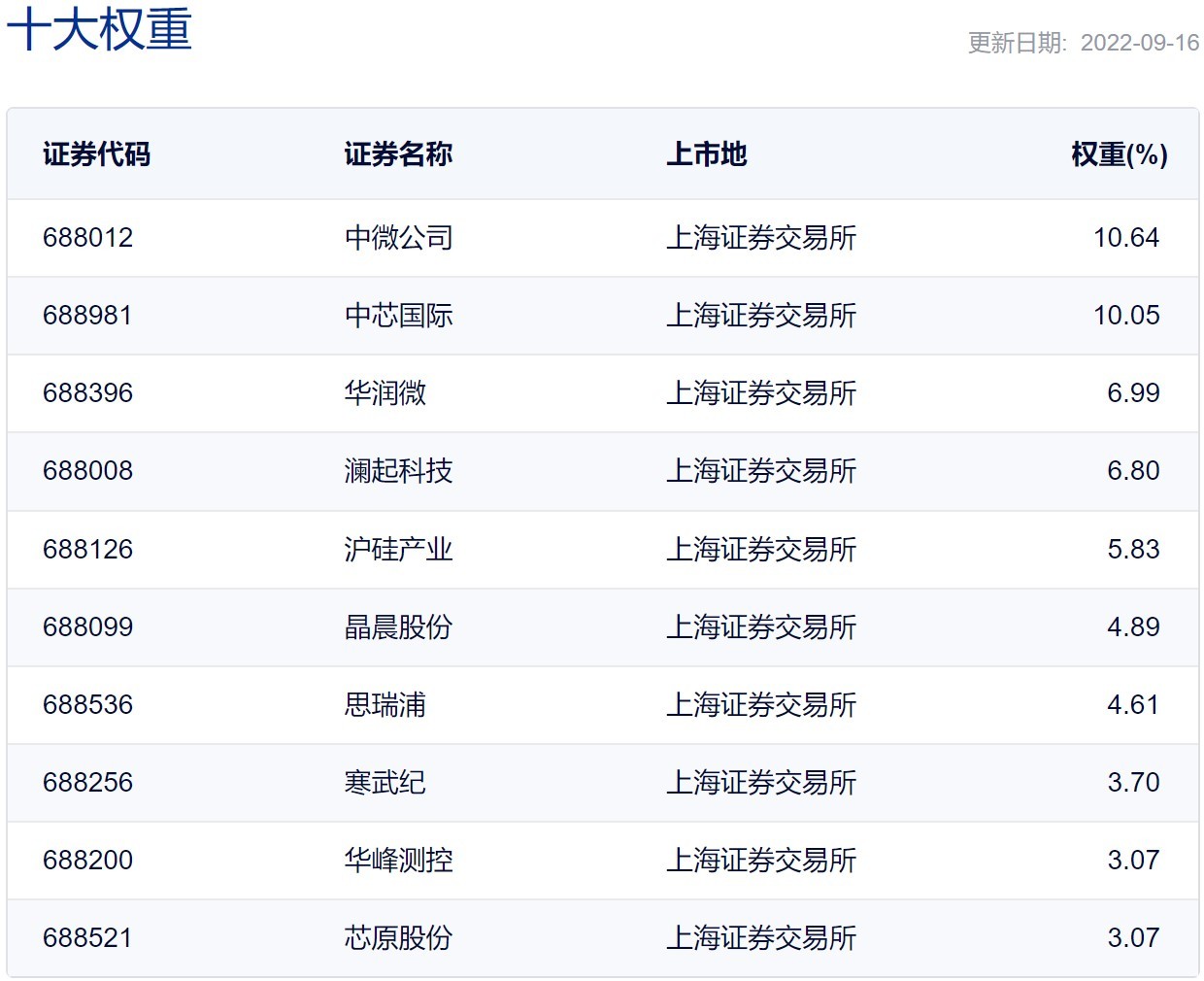 前十大权重股分别为中微公司、中芯国际、华润微、澜起科技、沪硅产业、晶晨股份、思瑞浦、寒武纪、华峰测控和芯原股份。