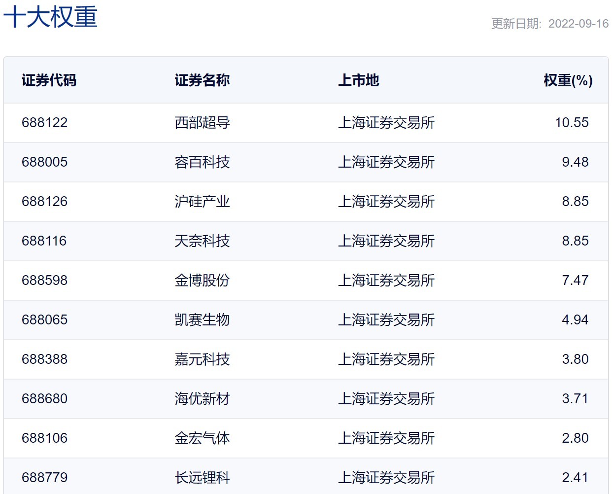 前十大权重股分别为西部超导、容百科技、沪硅产业、天奈科技、金博股份、凯赛生物、嘉元科技、海优新材、金宏气体和长远锂科。