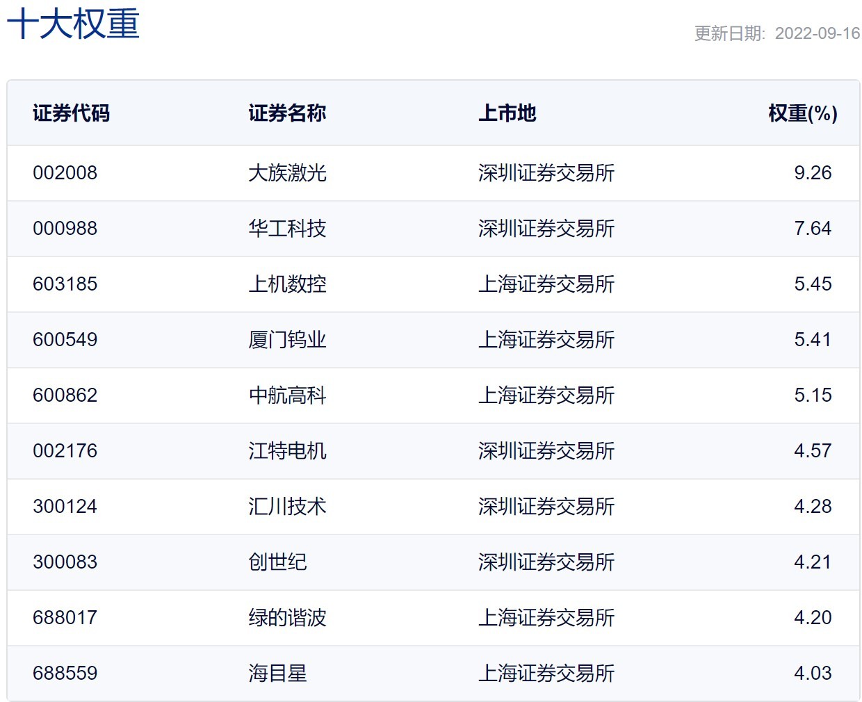前十大权重股分别为大族激光、华工科技、上机数控、厦门钨业、中航高科、江特电机、汇川技术、创世纪、绿的谐波和海目星。