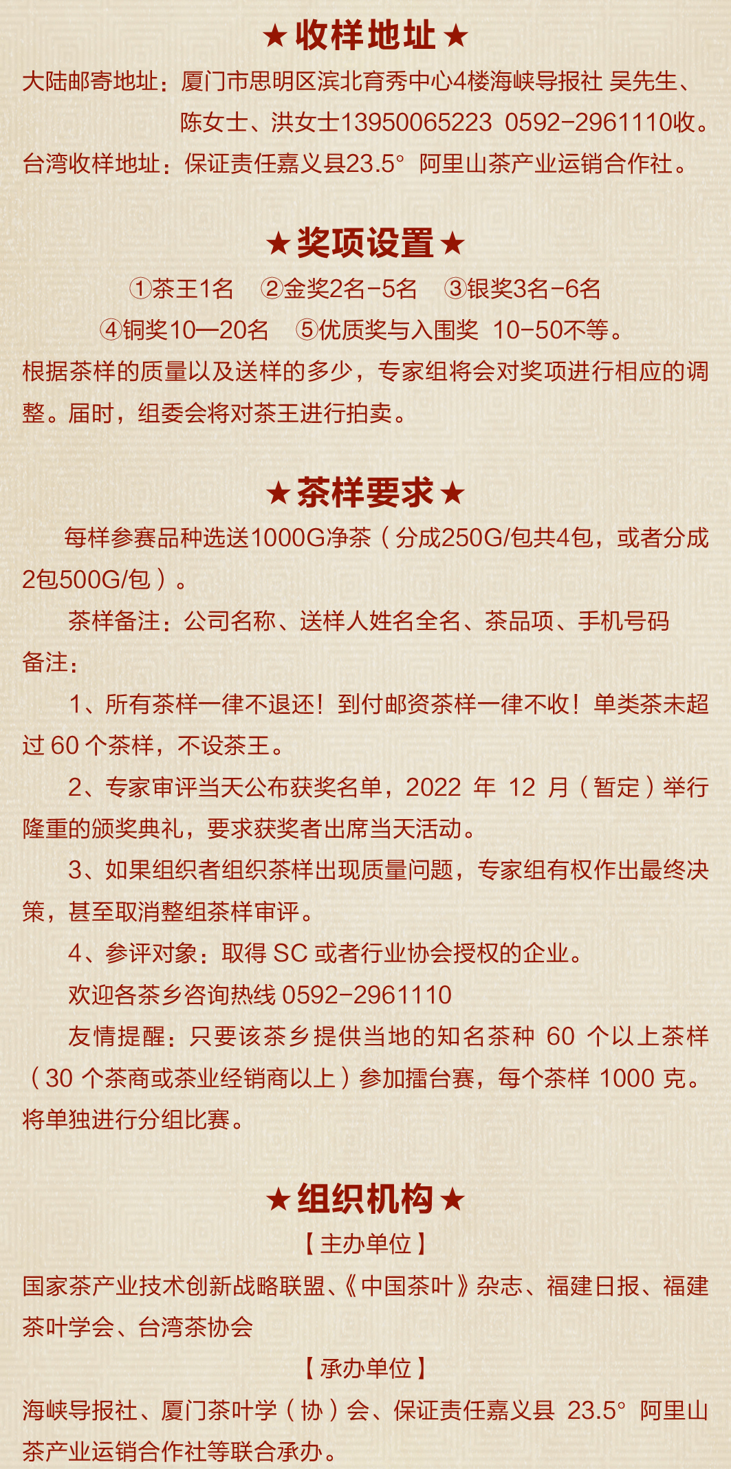 1、所有茶样一律不退还!到付邮资茶样一律不收!单类茶未超过60个茶样,不设茶王。