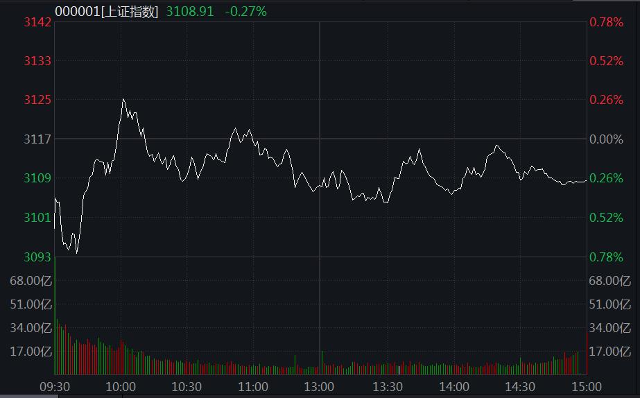 截至收盘,沪指跌0.27%,报3108.91点;深成指跌0.84%,报11114.43点;创业板指跌0.52%,报2319.42点。两市成交额6385亿元,较上个交易日放量26亿元。