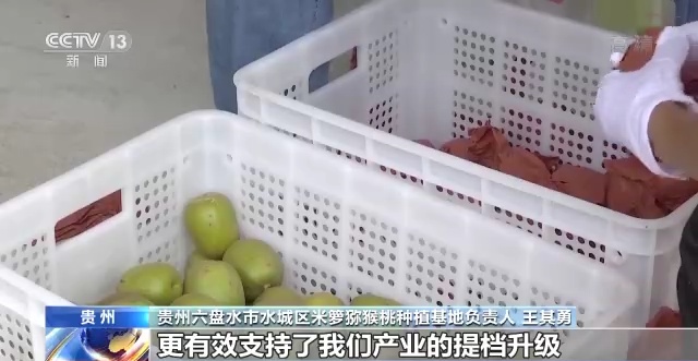 贵州六盘水市水城区米箩猕猴桃种植基地负责人 王其勇:这笔资金主要用来购买了1万吨左右的生物有机肥,不仅解决了当务之急,更有效支持了产业的提档升级,今年商品果率从原来的40%提升到了80%,按照平均亩产1400斤来算,商品果每亩达到1120斤,比原来翻了一番。